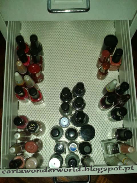 e por fim na sexta gaveta coloquei os que menos uso, os vermelhos, laranjas, nude's, cinzas, pretos, brancos